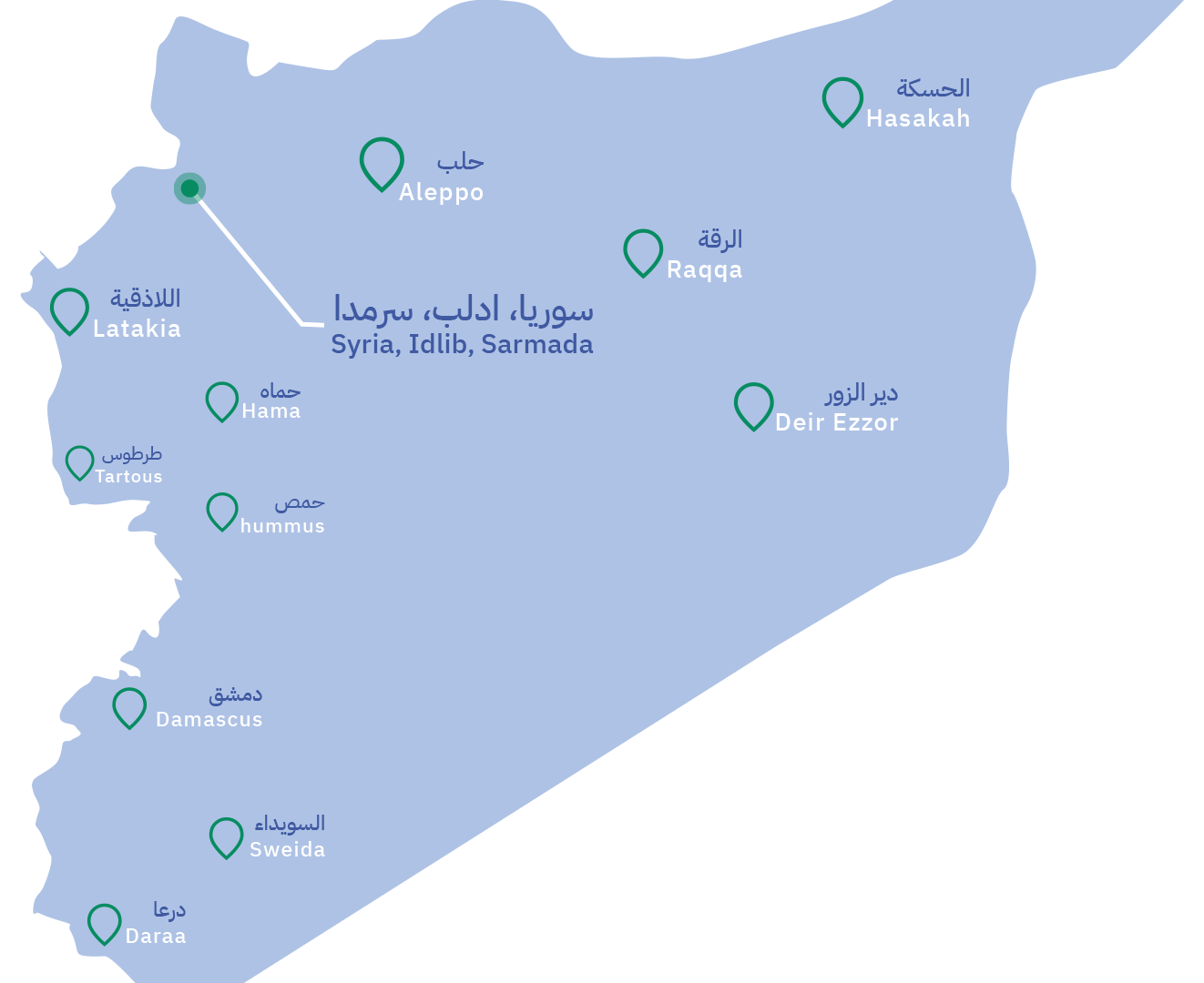 حلب + دمشق + اللاذقية + حمص + حماة + درعا دير الزور + الرقة + الحسكة + السويداء + طرطوس